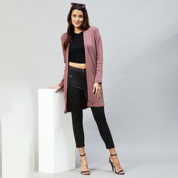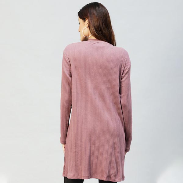 Purple self design open front longline shrug ,has long sleeves, straight hem